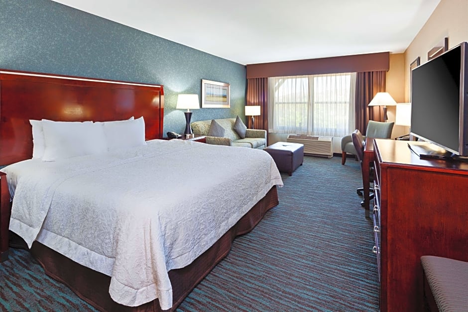 Whirlpool tub, sofa bed, HD TV, work space, coffeemaker, microwave, refrigerator, free WiFi Relax in this comfortable king studio which features a clean and fresh Hampton bed®, a relaxing whirlpool tub and a sofa bed. Catch up on work at the spacious desk with free WiFi and wired internet access. The bathroom offers plush towels and a shower featuring a curved shower rod for added space and light. A 37-inch HDTV, a microwave, refrigerator and a coffeemaker are also included for your convenience.